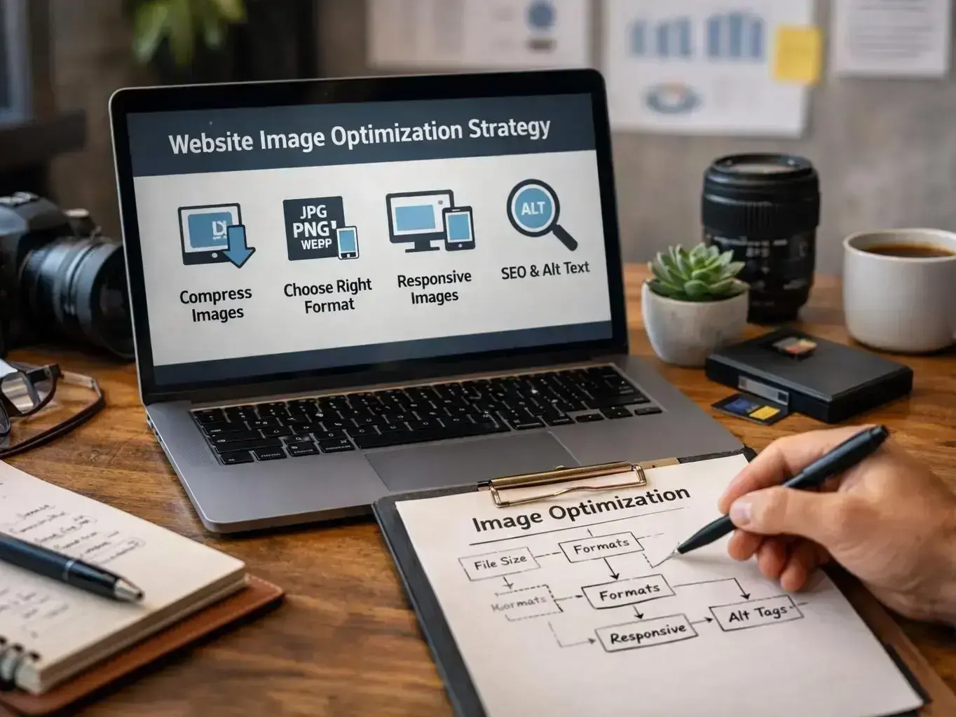 Image improvements help search engines read visual content through filenames, compression, and alt text. This work also supports accessibility and page speed.